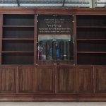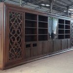 ספריית עץ מלא משולבת מדפים, ארוניות וויטרינות עם עיטרי עץ מיוחדים עבודת יד