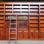 ספריה מעץ מלא משולבת מדפים וארוניות עם סולם וכותרת עם כיתוב באותיות זהב